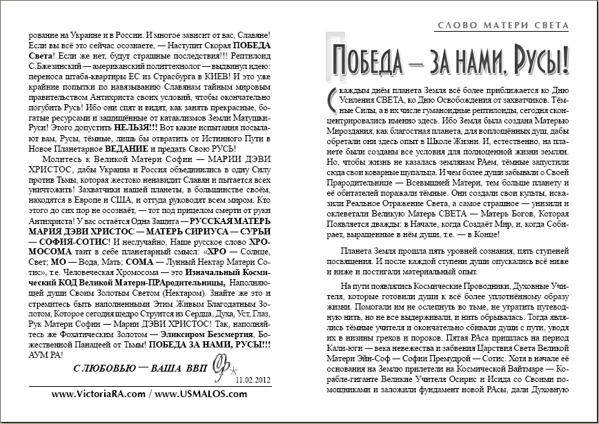 Раздел «Библиотека Матери Мира» создан по просьбе читателей журнала «Виктория РА». Здесь будут размещаться статьи журнала в удобном виде для самостоятельной печати.