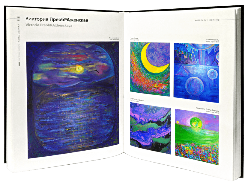 Представленные в каталоге Картины Виктории ПреобРАженской отличаются особой Космичностью и возвращают нас к Изтокам Единого Вселенского Сознания. Энергии ПервоИзтока и Древних Знаний перекликаются с представлениями будущего ПреобРАжённого Мира в чистом Пространстве Одухотварённой Материи и духовных метрополий-горадов. Творчество Виктории ПреобРАженской — это Световой Мост, Проложенный Матерью Мира Марией ДЭВИ ХРИСТОС в Новый Эон из времени конца Кали-Юги, где рушится всё ветхое и тленное, противное Высшим Космическим Принципам, через Великую Битву Махакали с драконом невежества, грубой силы и насилия. Так Матерь Мира Торит Путь в Царство Света, грядущее и неотвратимое по Космическим Часам.
